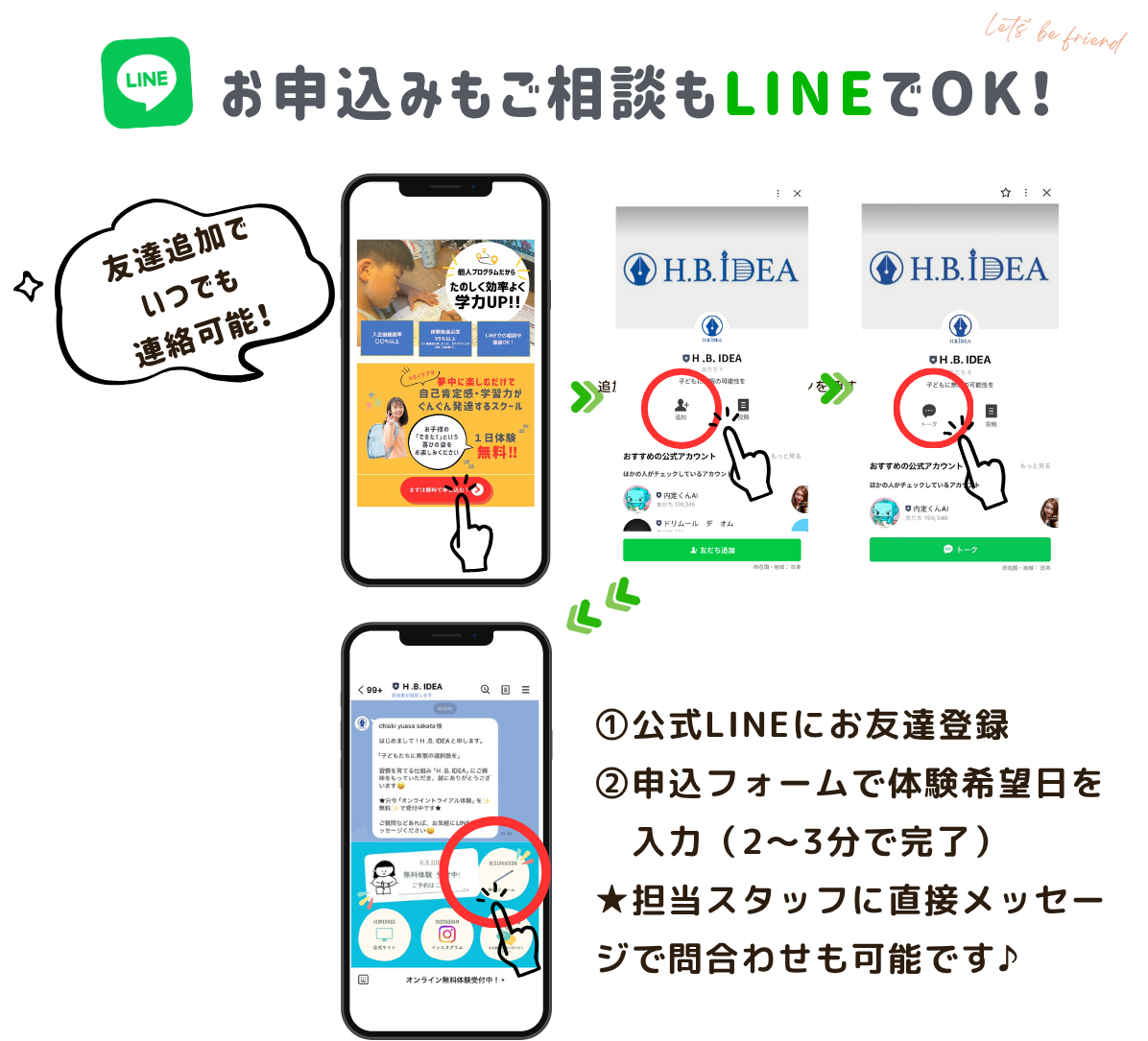 お問い合わせもLINEから!このボタンから「HBイデア公式LINE」を友だち追加いただき、直接メッセージをご入力ください。